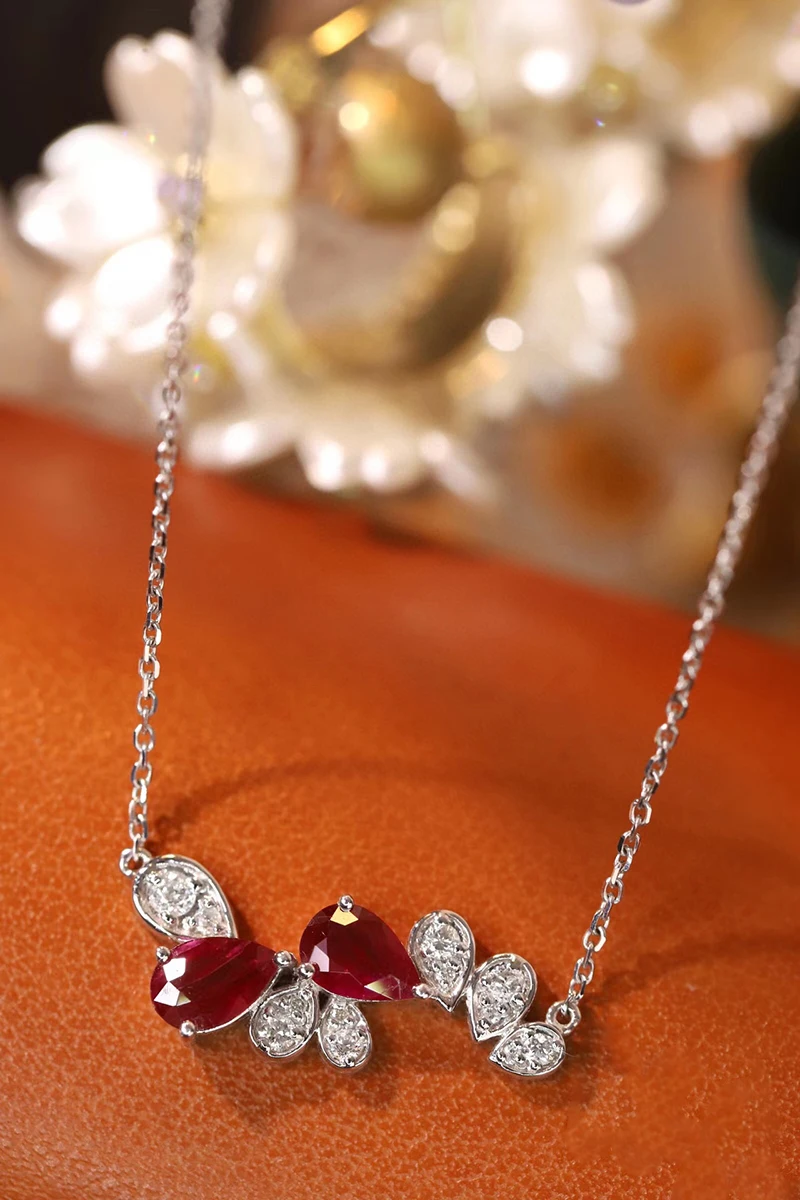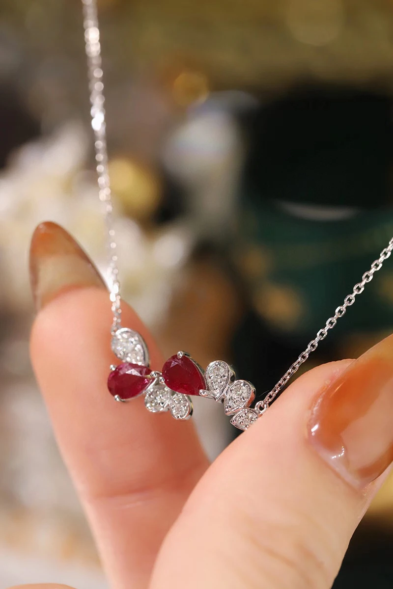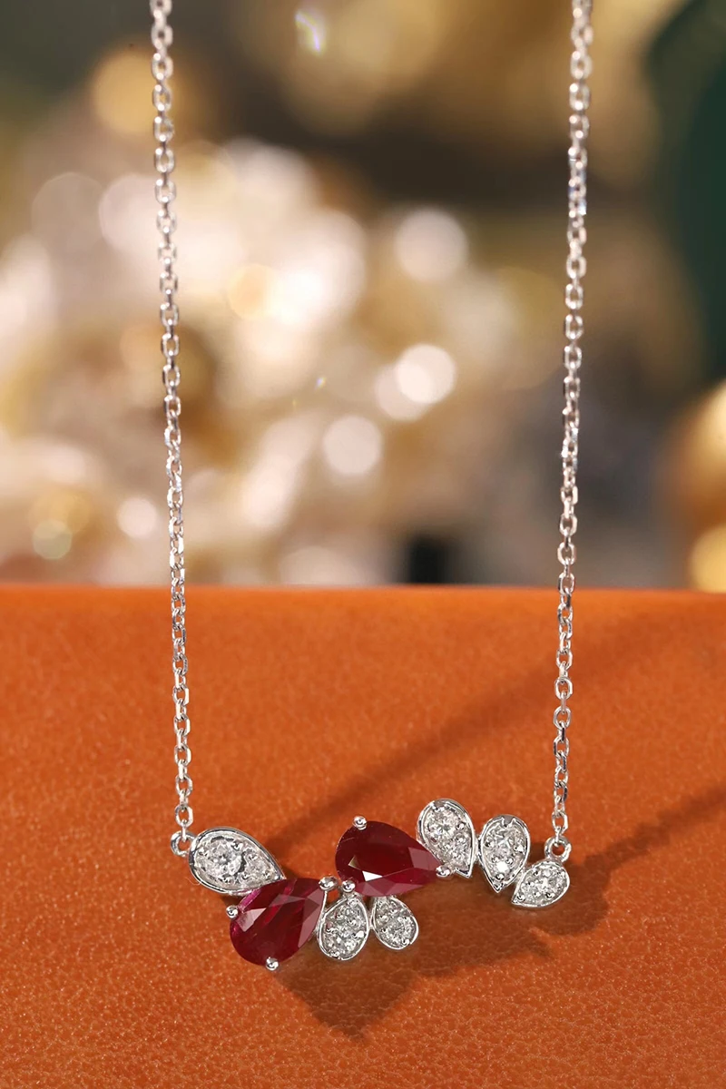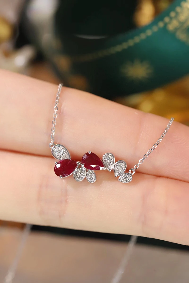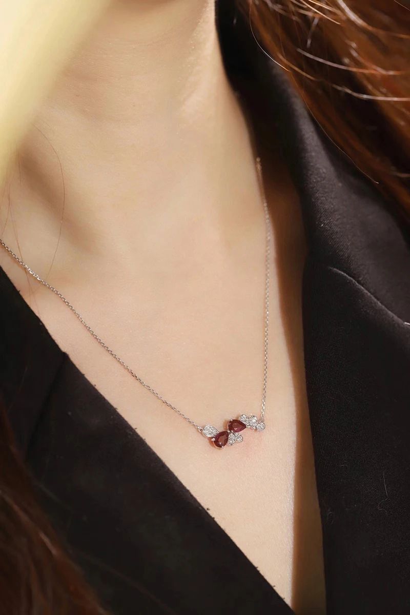 LUOWEND 18K White Gold Real Natural Diamond and Ruby Necklace for Women