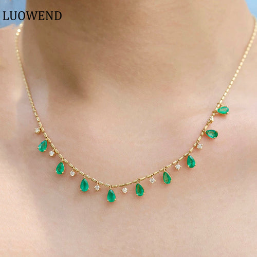 LUOWEND 18K Yellow Gold Real Natural Emerald and Diamond Gemstone Necklace for Women